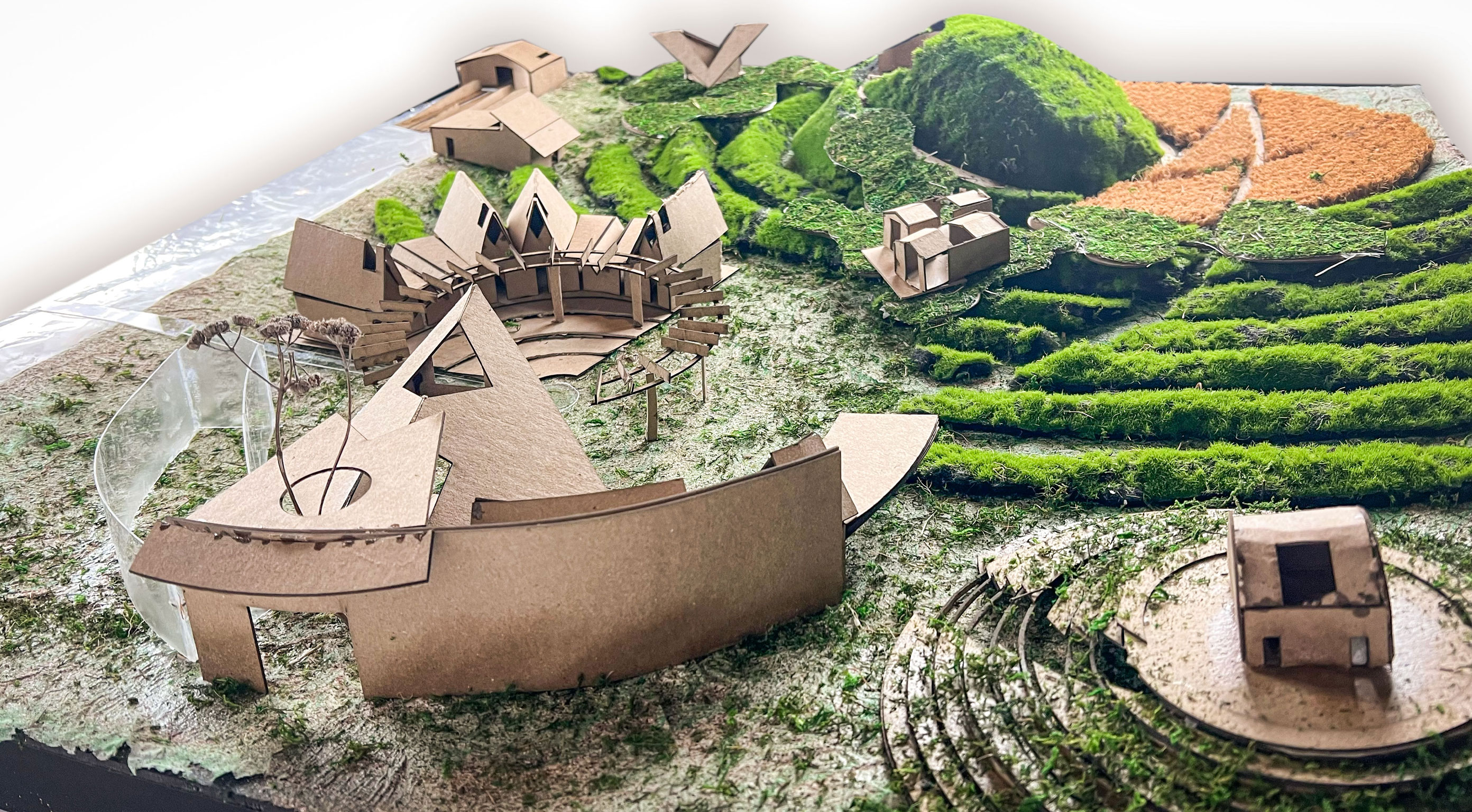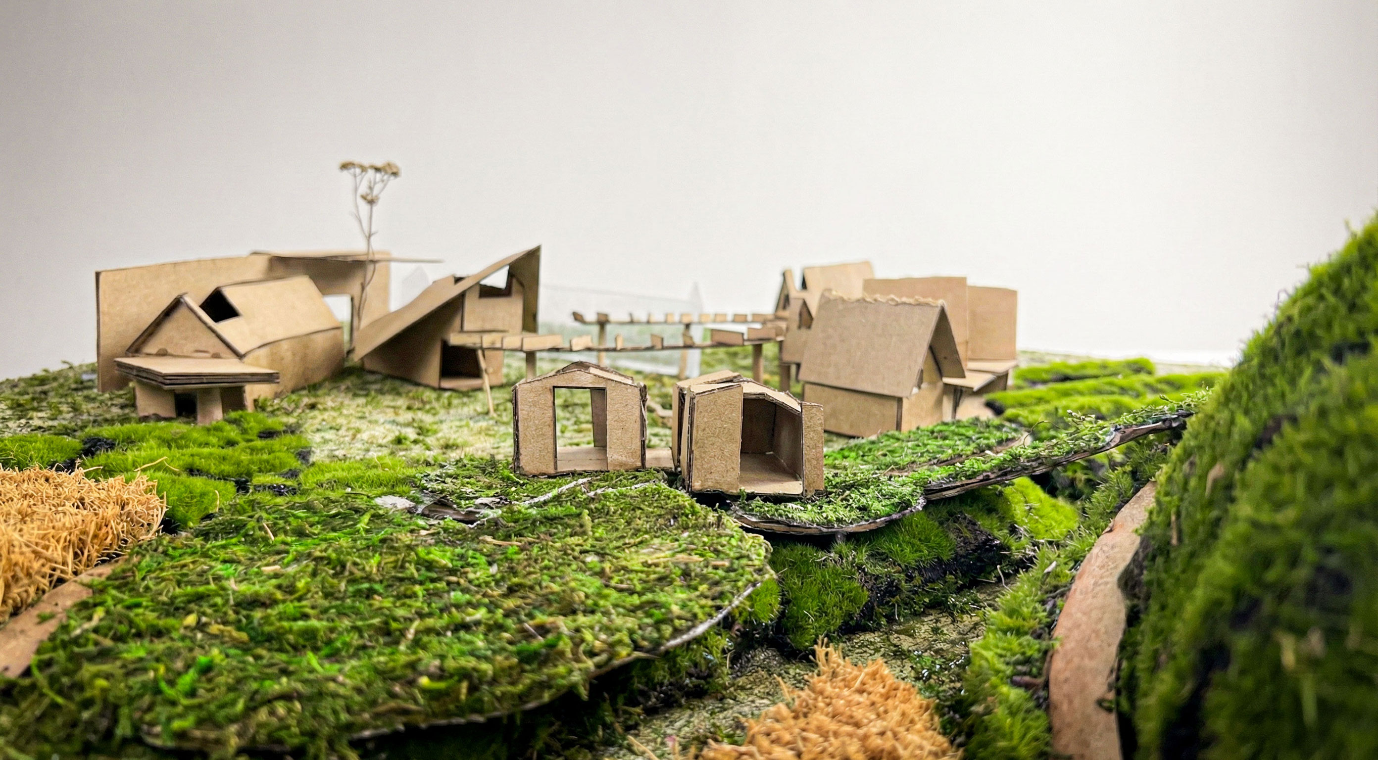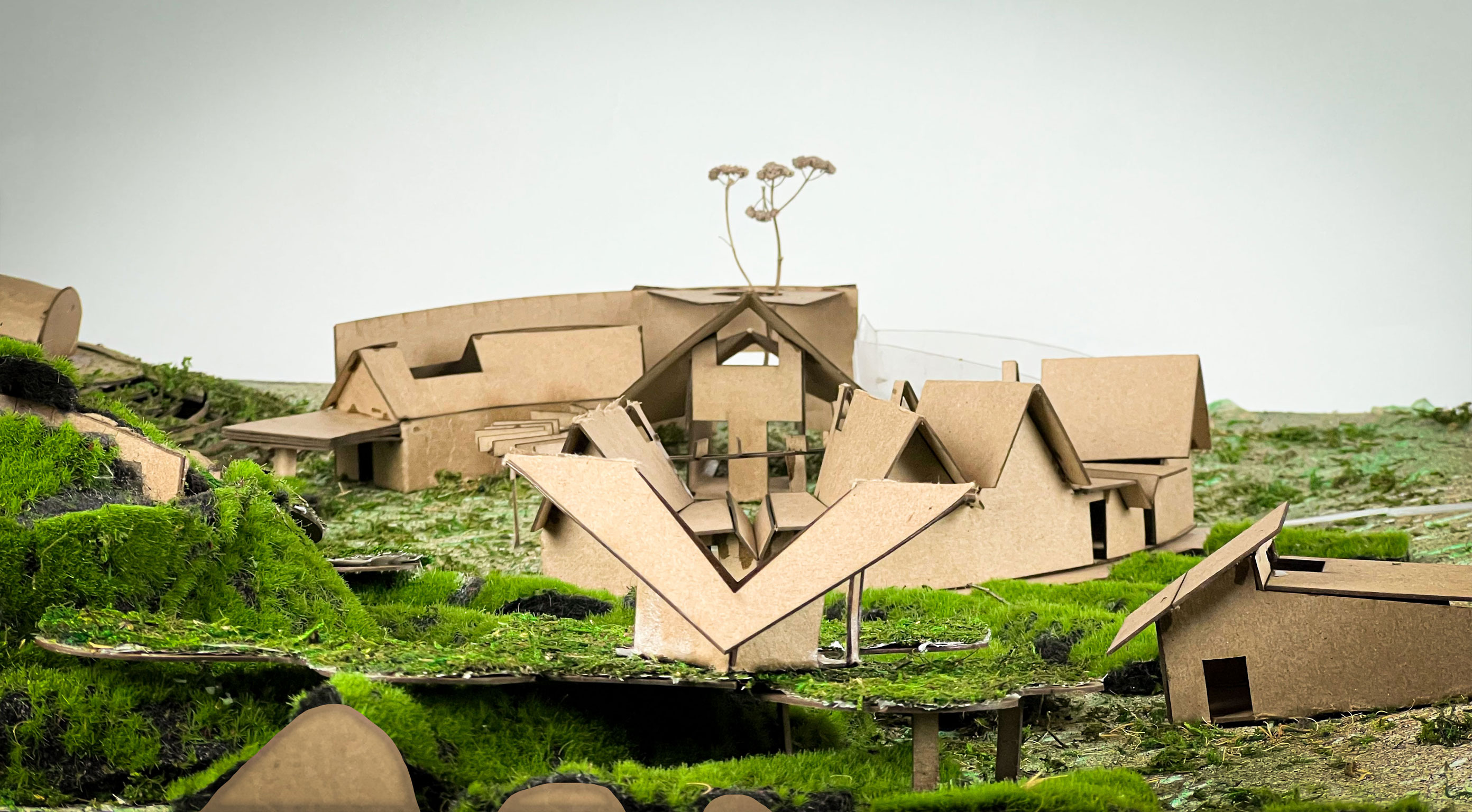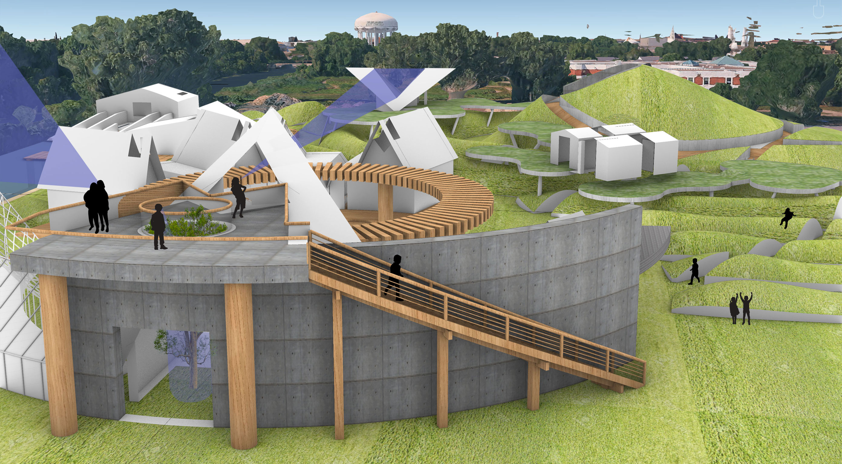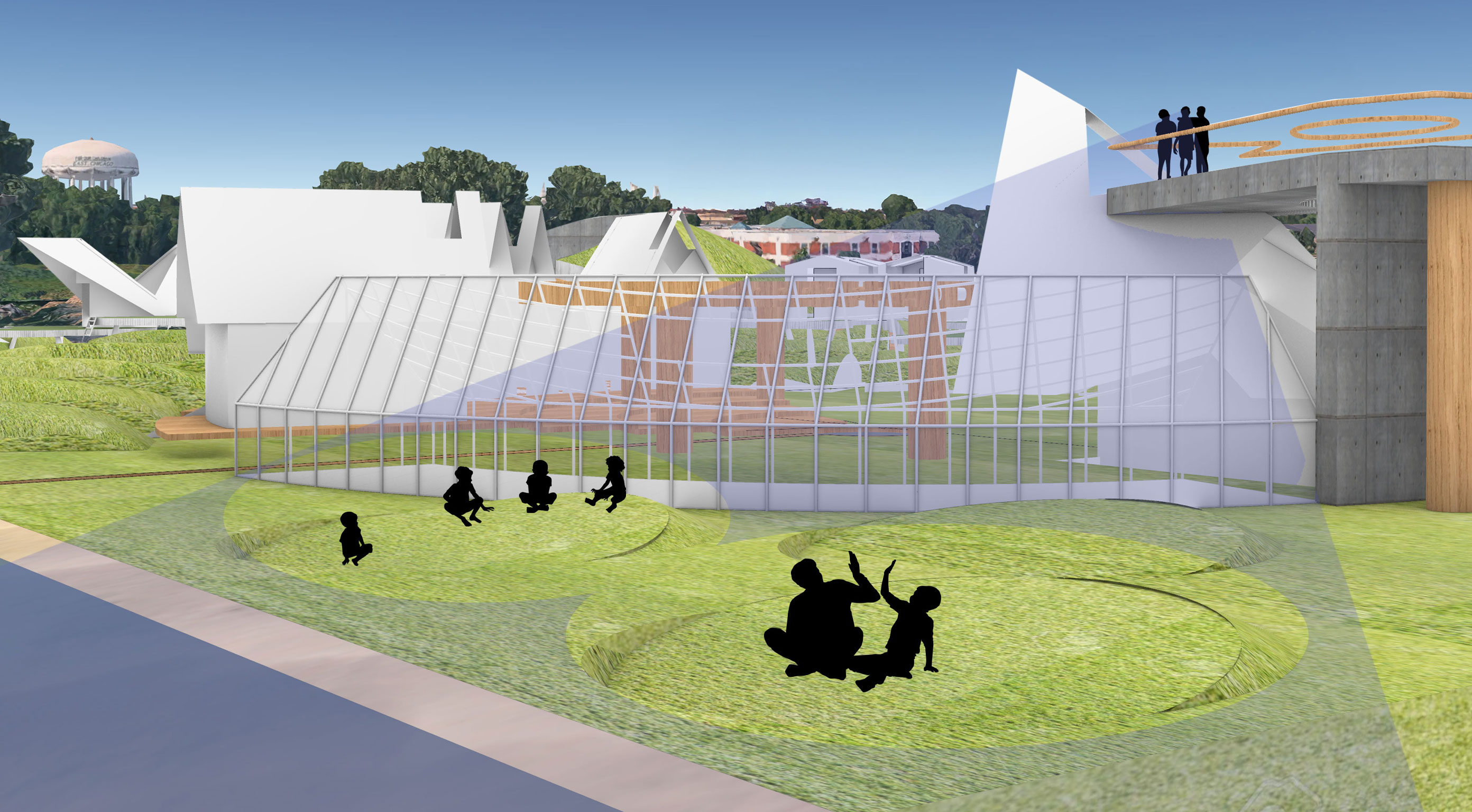 The project goal was to create a “village” for a Superfund site in East Chicago, Indiana that was affected by industrial age lead and arsenic pollution in the soil and water. This project serves as both a community lounge and a remediation center. The architecture facilitates a 100-year healing process, allowing humans to care for the land while providing habitat for non-human life. This “village” included a composition of 12 “elements with max 1,200 sq ft per element only permitted single-ridgeline roofs, specific rectangular apertures, and no double-curved surfaces. This was designed to evolve and weather over a century.