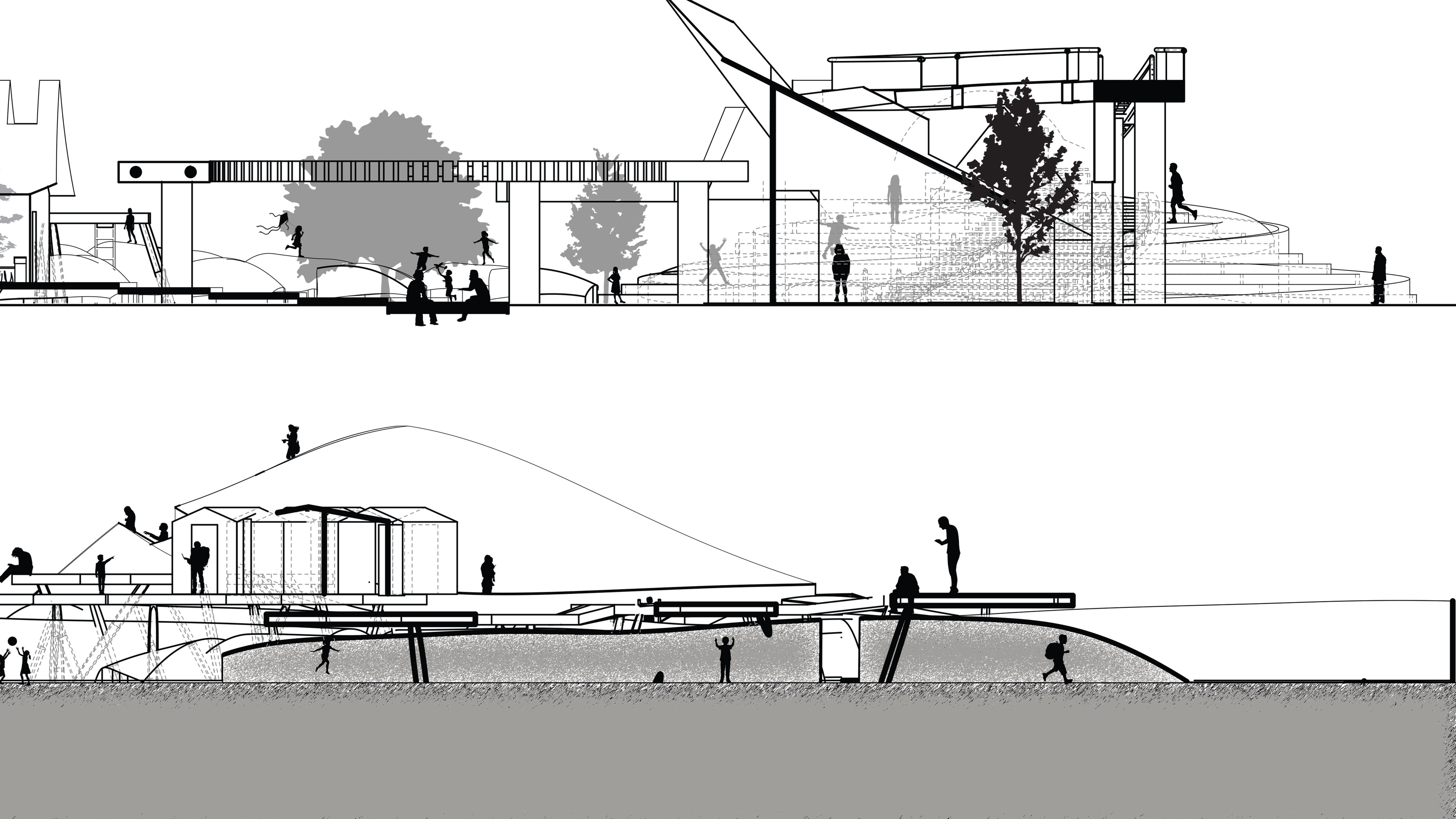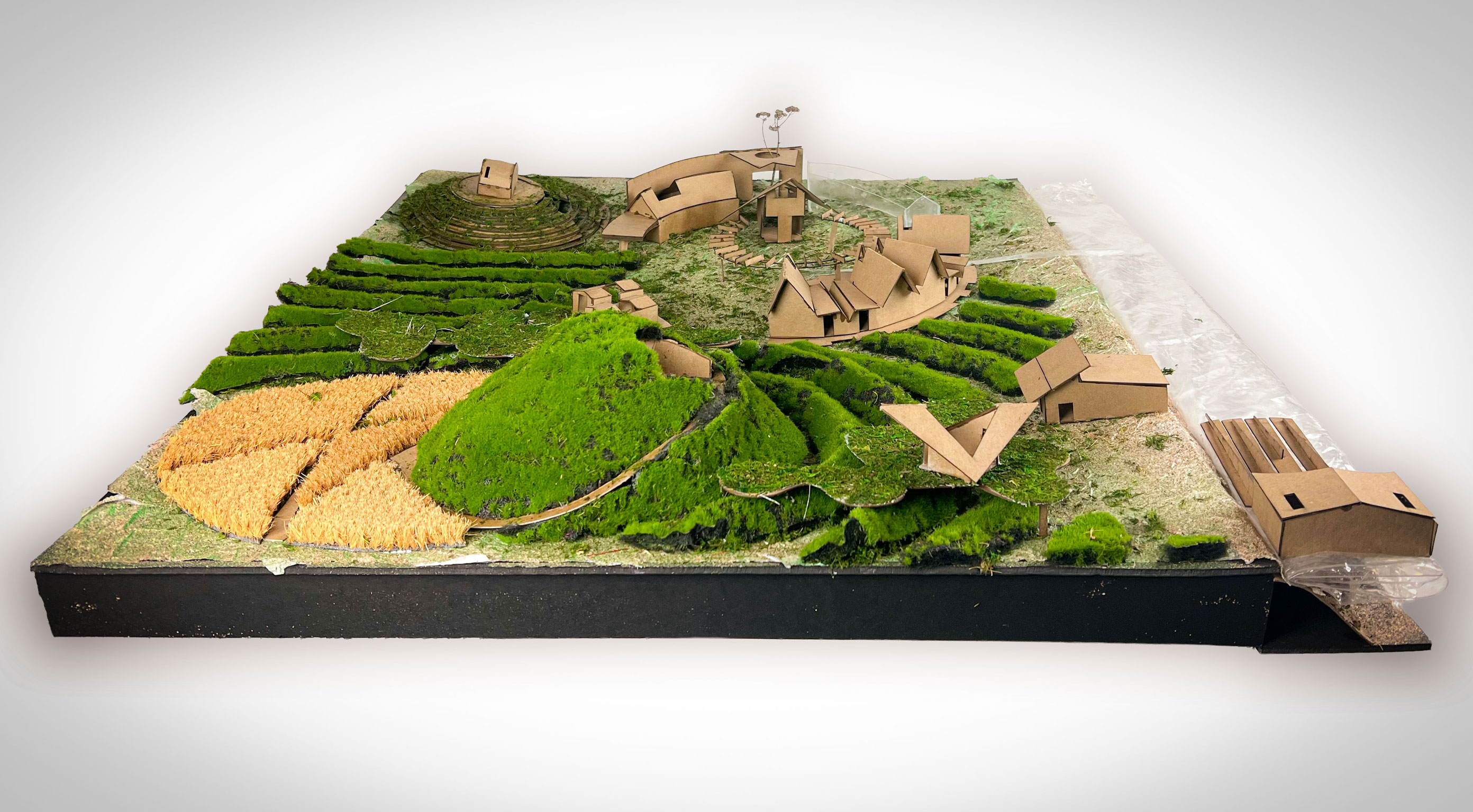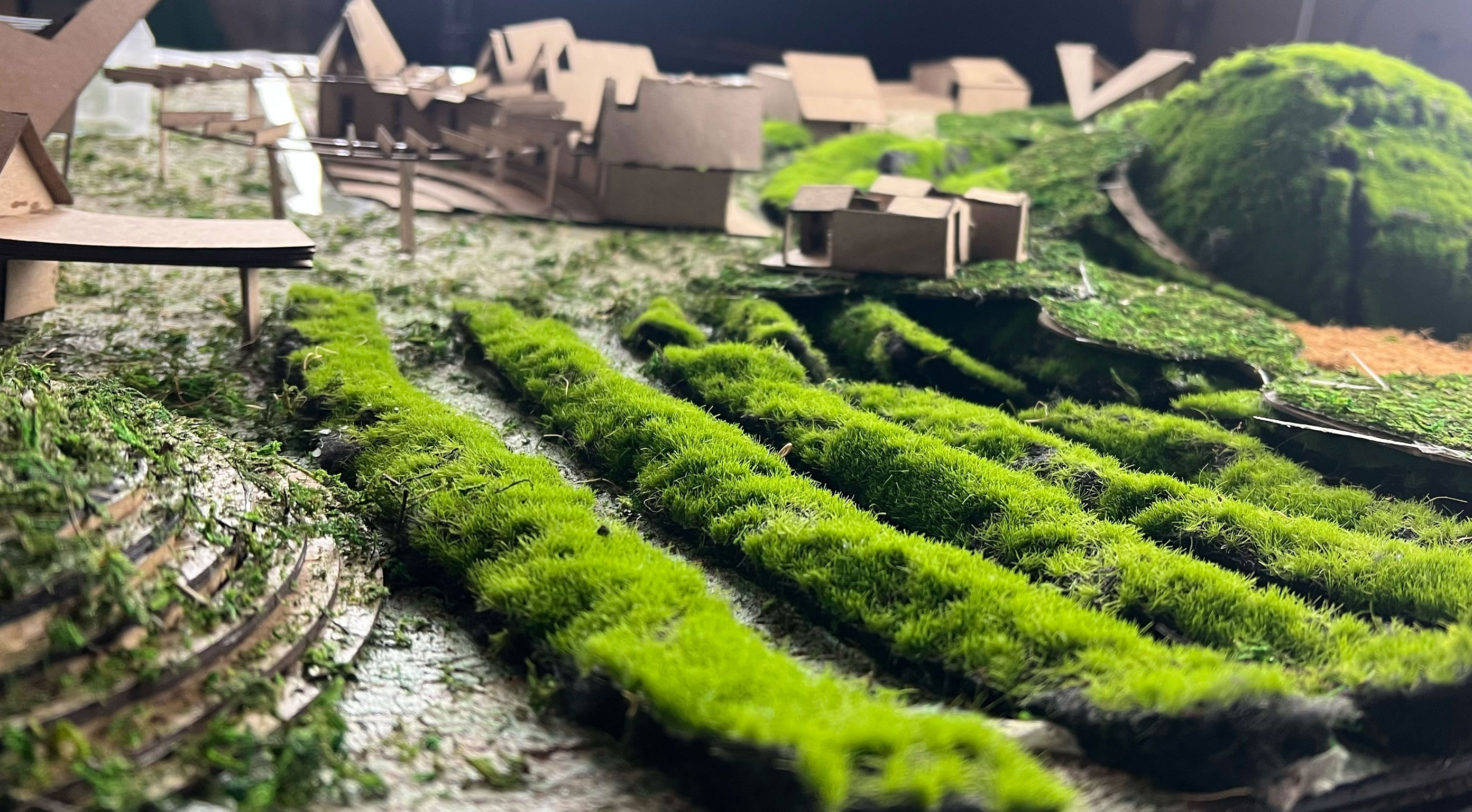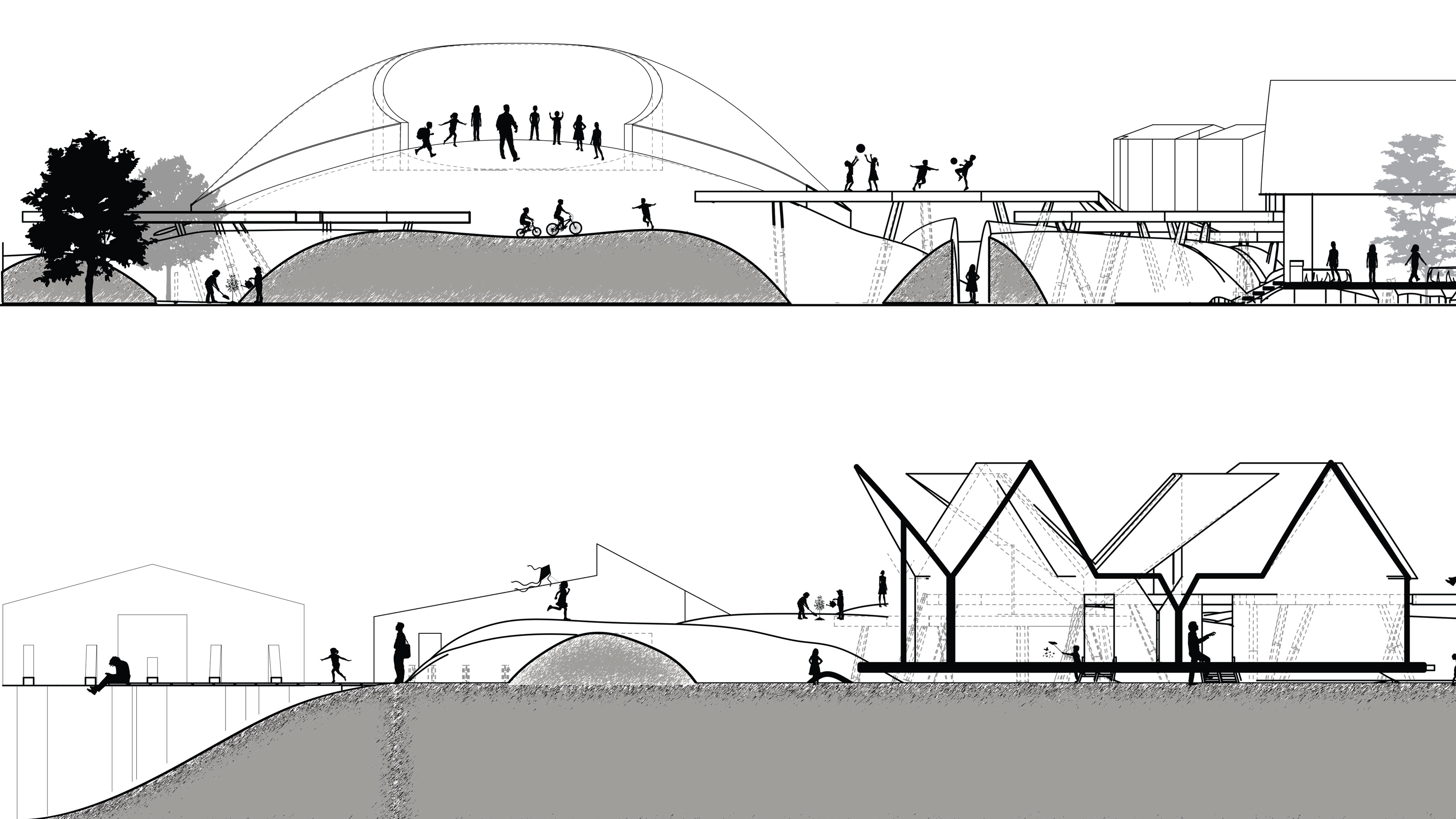 The project goal was to create a “village” for a Superfund site in East Chicago, Indiana that was affected by industrial age lead and arsenic pollution in the soil and water. This project serves as both a community lounge and a remediation center. The architecture facilitates a 100-year healing process, allowing humans to care for the land while providing habitat for non-human life. This “village” included a composition of 12 “elements with max 1,200 sq ft per element only permitted single-ridgeline roofs, specific rectangular apertures, and no double-curved surfaces. This was designed to evolve and weather over a century.