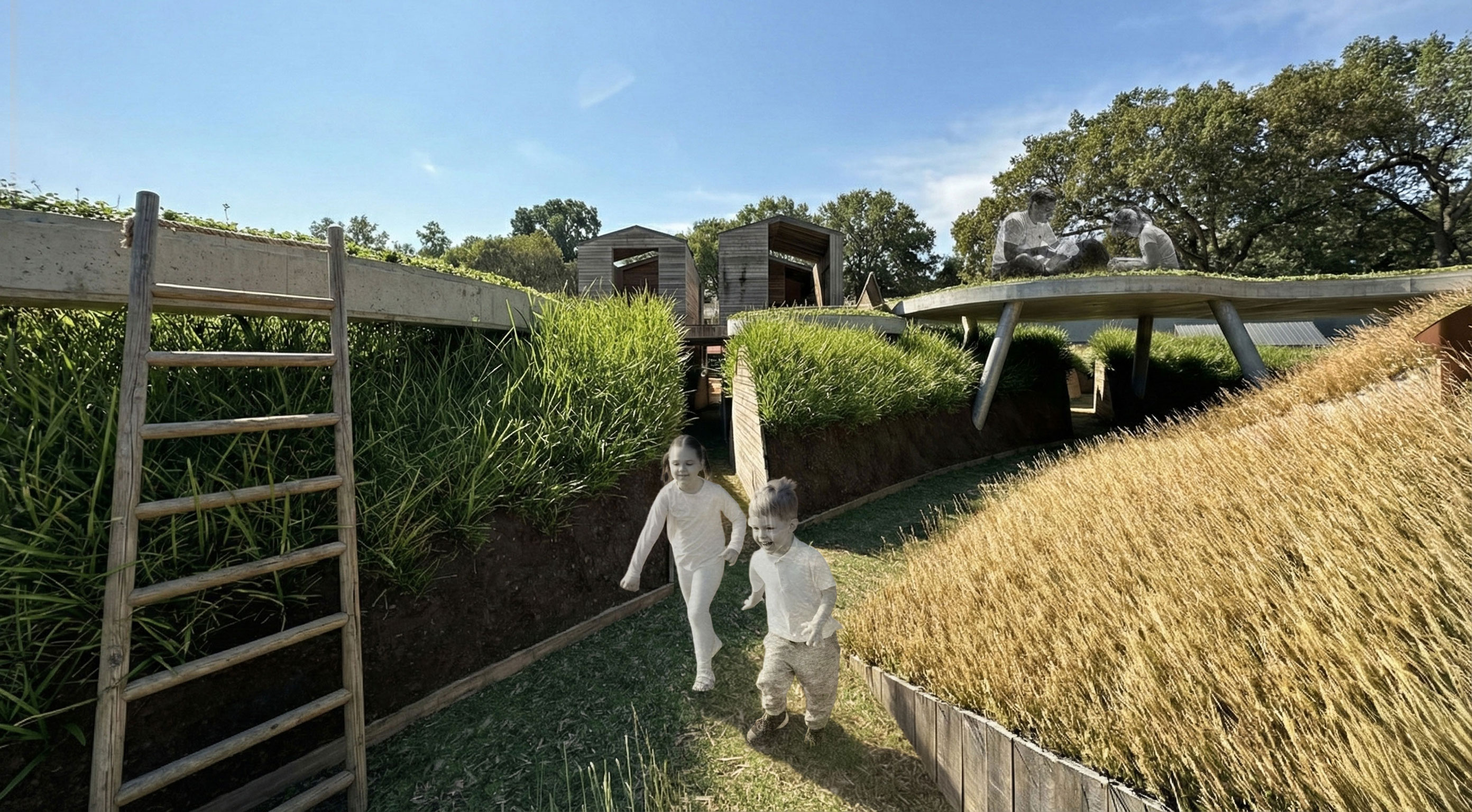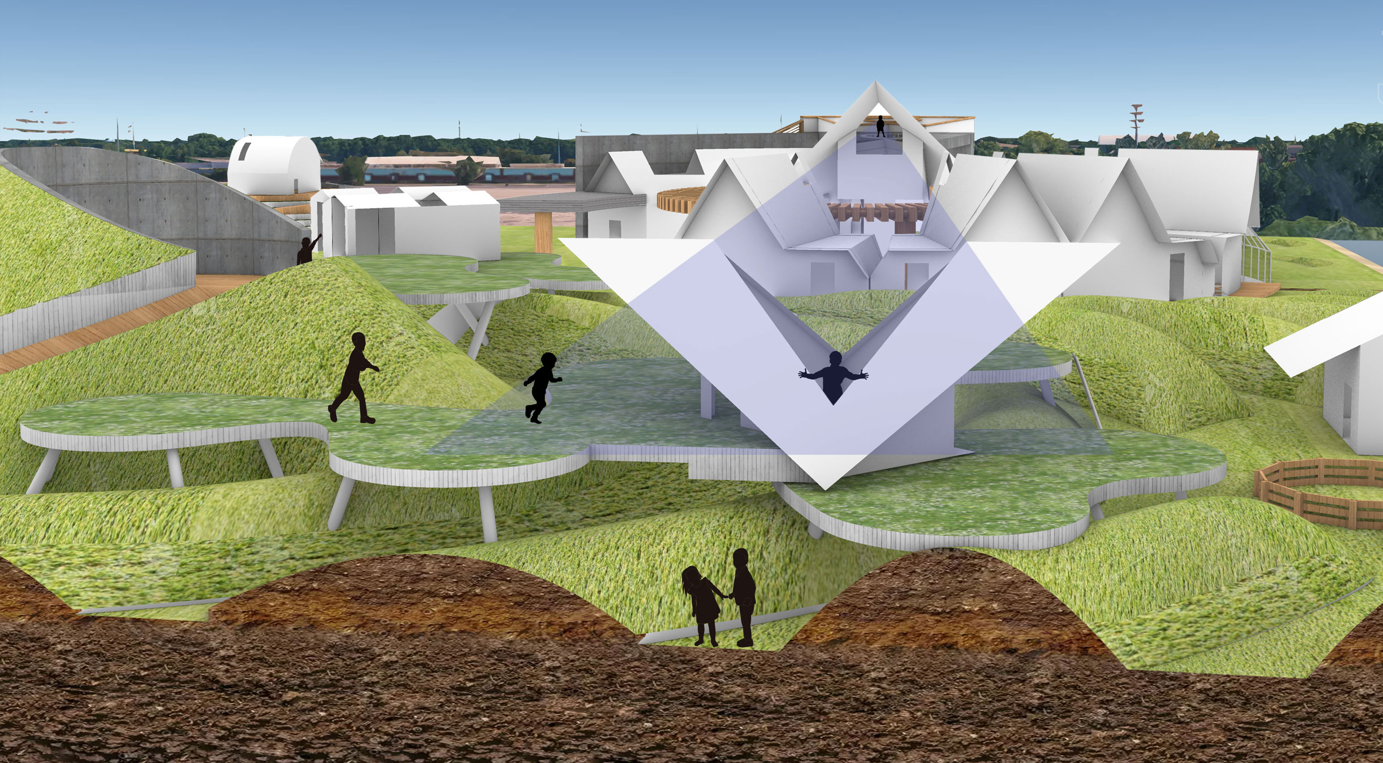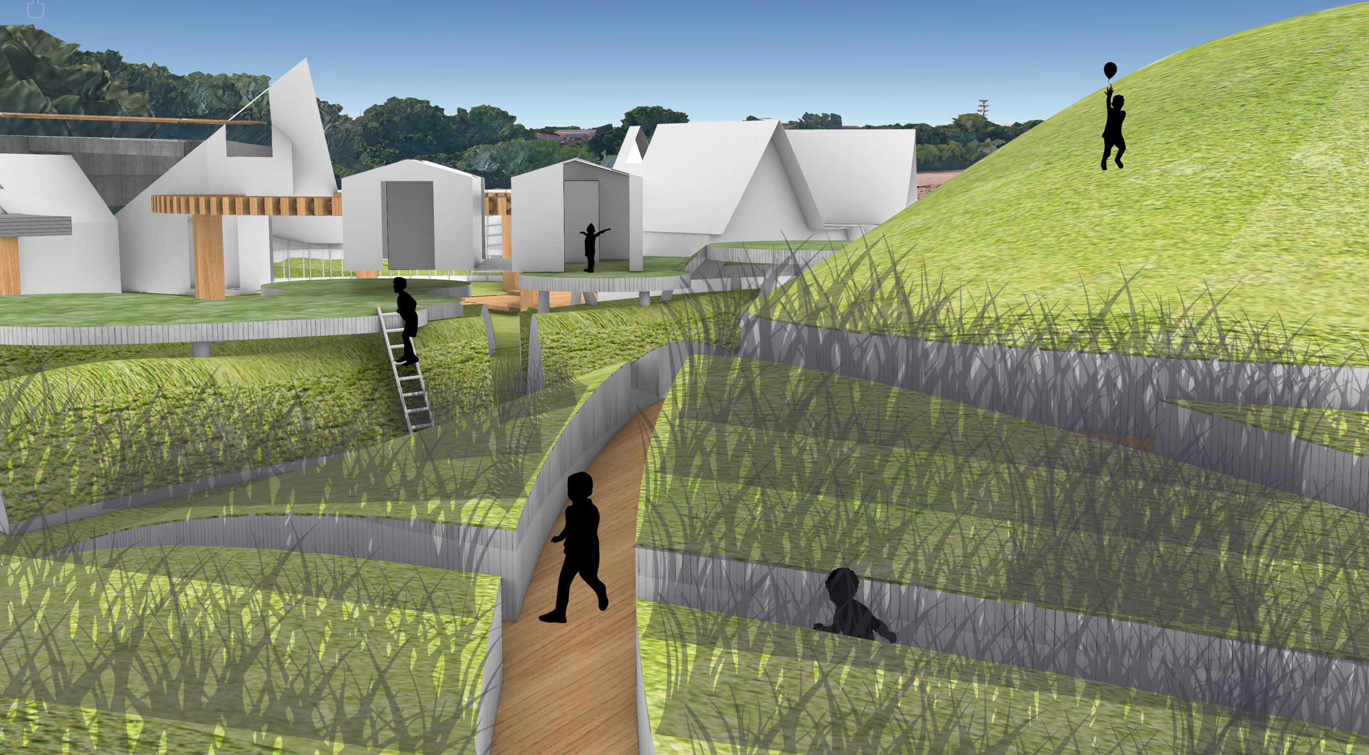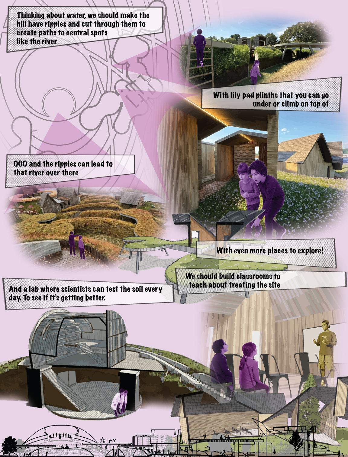 My project is anchored by the concept of water ripples radiating outward to organize the site. Pathways carve through these grass ripples, guiding visitors toward central nodes and curated viewpoints. At the base of the hill, the design evokes the feeling of running through a field of tall grass. This creates a moment of mystery and frolicking where the path ahead is obscured. Rising from these ripples are lily pad plinths that invite vertical exploration where visitors can shelter beneath or climb atop them and explore the playful pavilions with views of the site. Ultimately, the goal is to capture a sense of childlike wonder, encouraging people to explore the space with curiosity and joy.