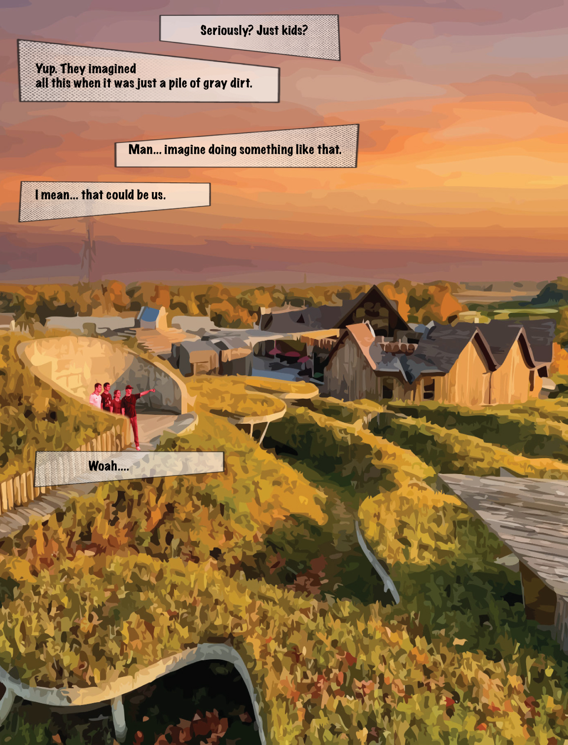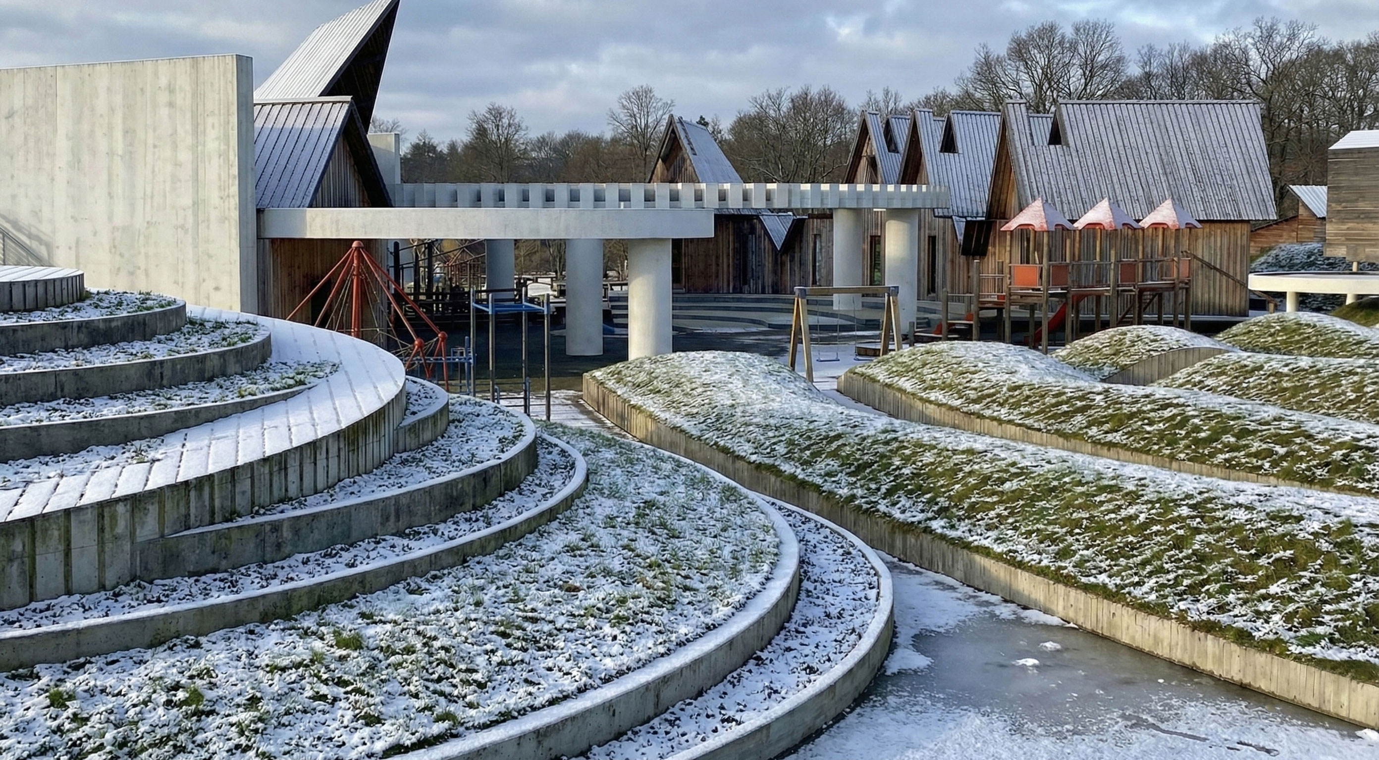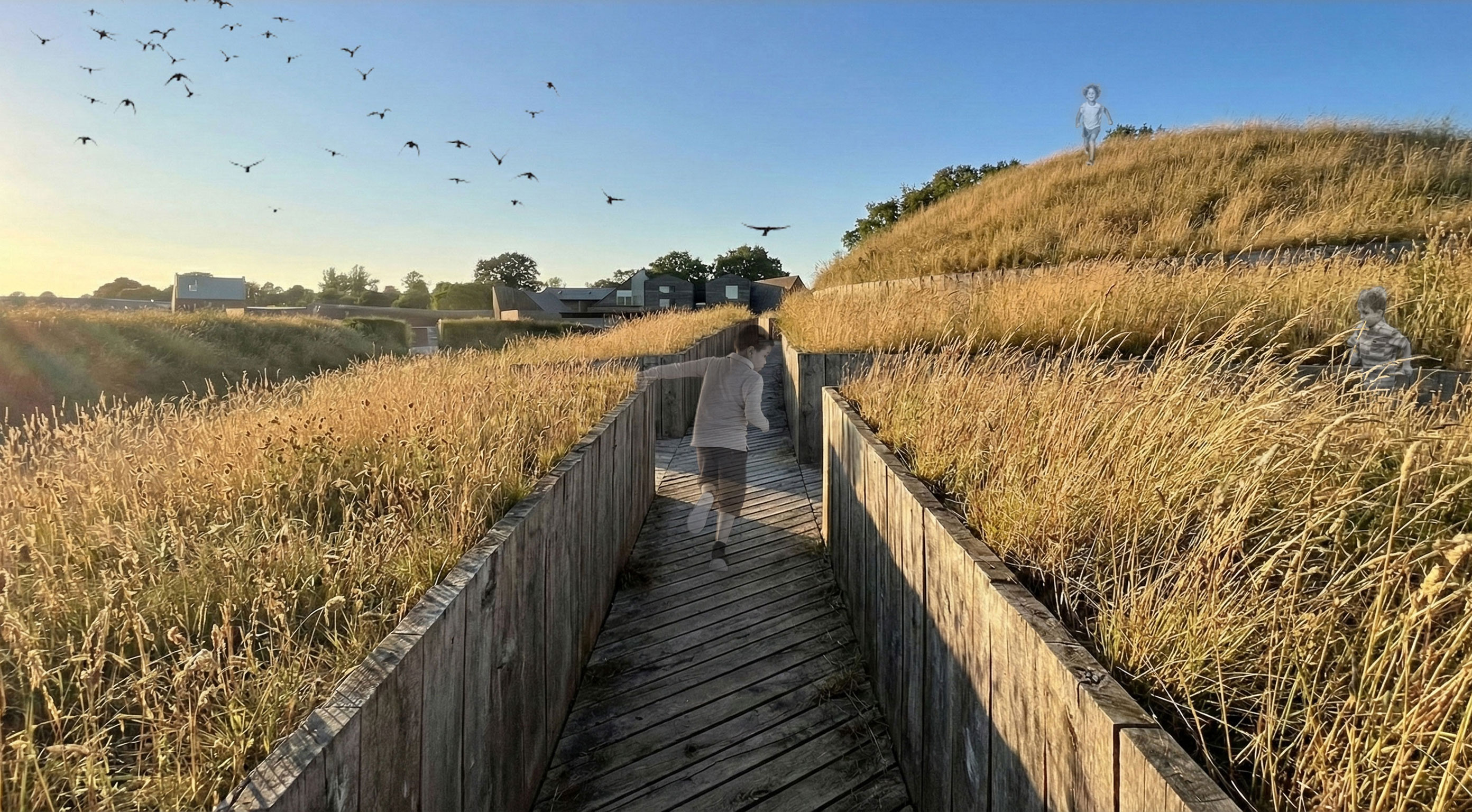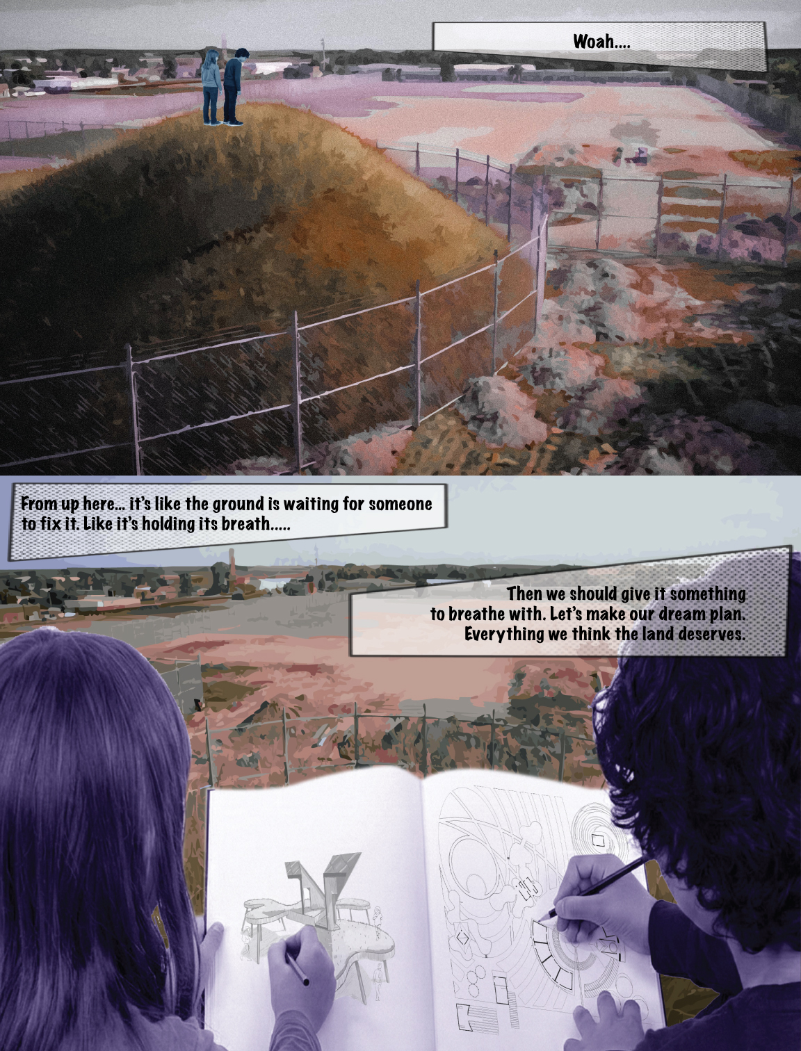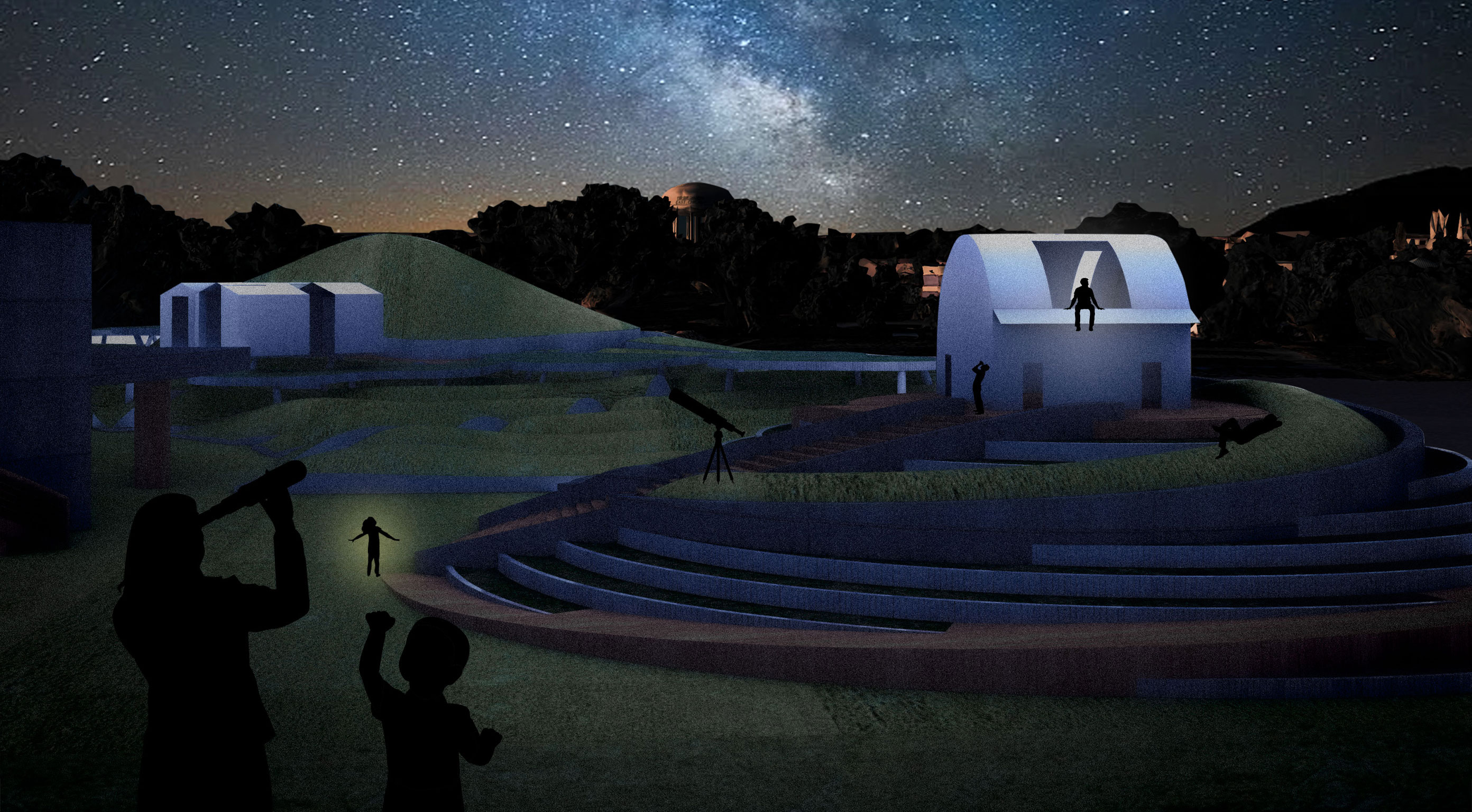 My project is anchored by the concept of water ripples radiating outward to organize the site. Pathways carve through these grass ripples, guiding visitors toward central nodes and curated viewpoints. At the base of the hill, the design evokes the feeling of running through a field of tall grass. This creates a moment of mystery and frolicking where the path ahead is obscured. Rising from these ripples are lily pad plinths that invite vertical exploration where visitors can shelter beneath or climb atop them and explore the playful pavilions with views of the site. Ultimately, the goal is to capture a sense of childlike wonder, encouraging people to explore the space with curiosity and joy.