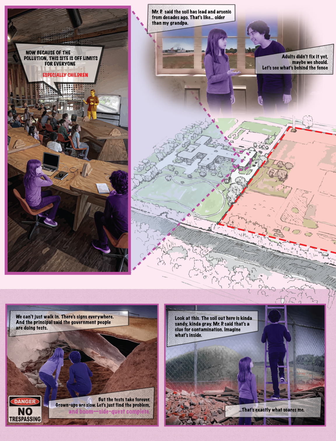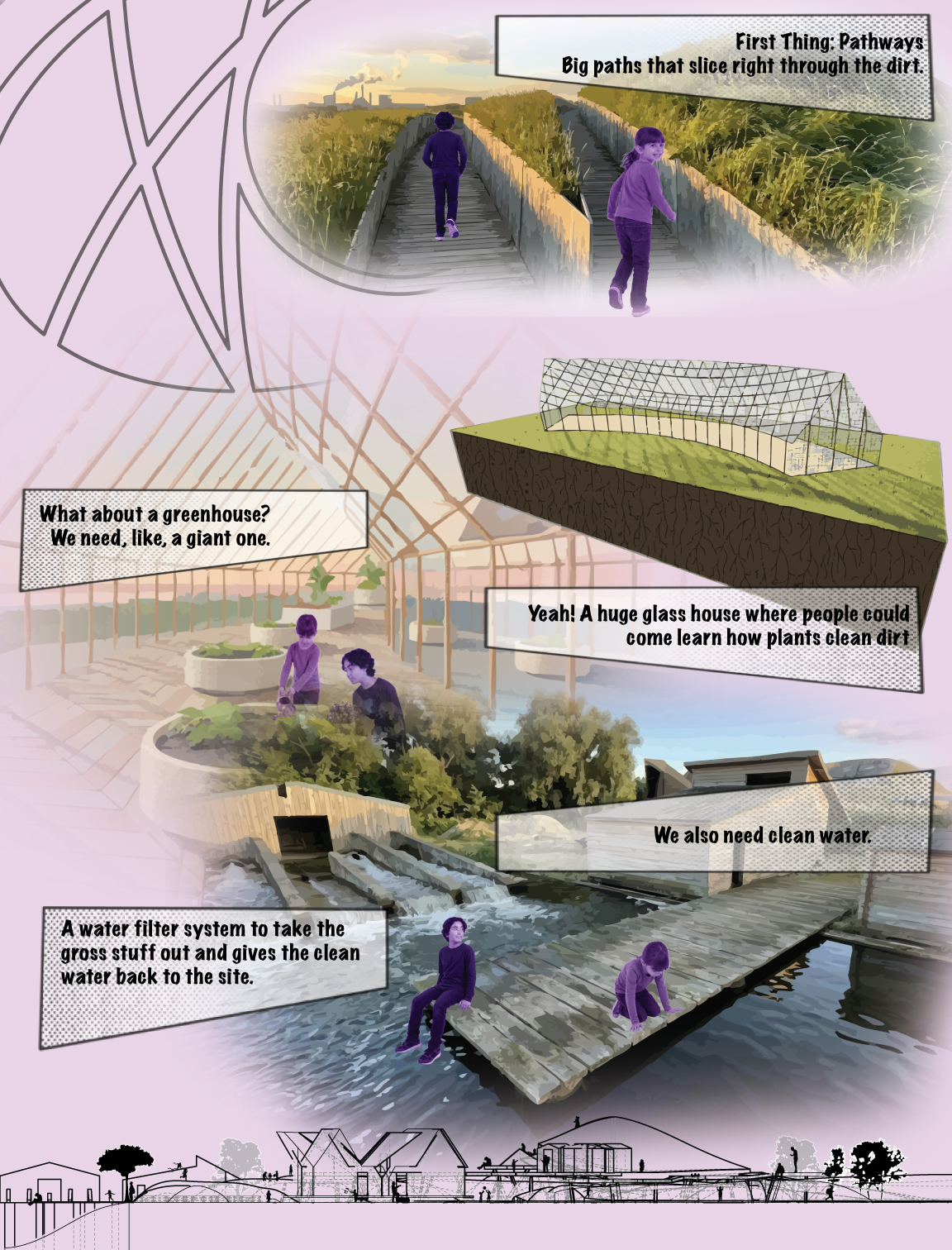 This superfund site is in close proximity to an elementary school for my Eco-Lounge. I designed a park / educational camp space that cleaned river water and was a space to study and teach about soil remediation for this site. This site is productively educational and serves as a recreational space for children getting out of class. This site includes a Main hill observation deck, lab / observatory, classrooms, greenhouse, recreational water activities shack, garden pens, pier, and many explorational buildings.
